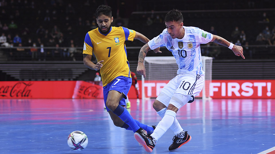 Brasil arrancó el encuentro intentando dominar el encuentro, pero la primera gran ocasión fue obra de Alan Brandi, que se plantó delante de Guitta pero el guardameta respondió bien y echó el balón al saque de esquina. La respuesta de los brasileños llegó por mediación de Arthur, que, con un chut potente, obligó a la estirada a Sarmiento. En el ecuador del primer tiempo, Dyego protagonizó su clásica jugada y efectuó un lanzamiento con la diestra que Sarmiento envió al saque de esquina. En el minuto 11, Borruto inauguró el marcador tras un saque de esquina en el que remató con la puntera al segundo palo. Dos minutos después, en un rápido contragolpe, Borruto amplió la ventaja con el 0-2. Pito y Claudino enviaron el balón al poste en sendas ocasiones y, en el minuto 17, Ferrao rescató a su equipo marcando el 1-2 en una acción al segundo palo.
