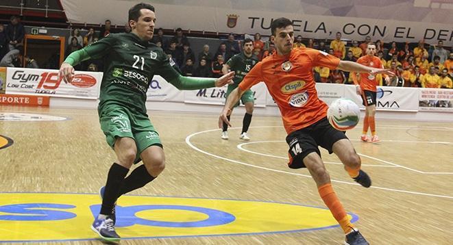 Tras el paso por vestuarios, los locales lograron ver puerta. A los veintidós minutos de juego, David Pazos logró superar a Cone para marcar el primer tanto de la tarde en el Ciudad de Tudela. El ex de Palma Futsal aprovecho una pérdida de los andaluces para superar en el mano a mano al meta rival. Antes, los naranjas ya habían avisado del peligro con una buena ocasión en los pies de Pedro. Un minuto más tarde del tanto local, Miguel Fernández con un reverso busco el tanto con un remate que se fue por muy poco de la meta de Gus. Miguel también se sumó al ataque en busca del empate, pero de nuevo apareció Gus para evitarlo.