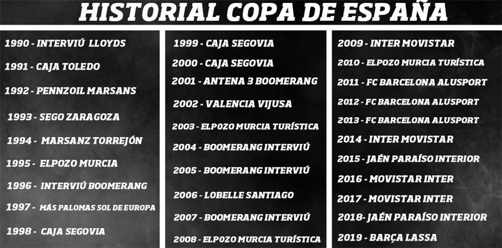 Un total de 14 equipos han conseguido levantar el trofeo más codiciado de la Liga Nacional de Fútbol Sala. Movistar Inter se corona como el conjunto que más veces lo ha hecho, un total de 10 veces, seguido por ElPozo Murcia y el Barça Lassa (4). Con este triunfo, los azulgranas igualan al que fue su rival en la gran Final.