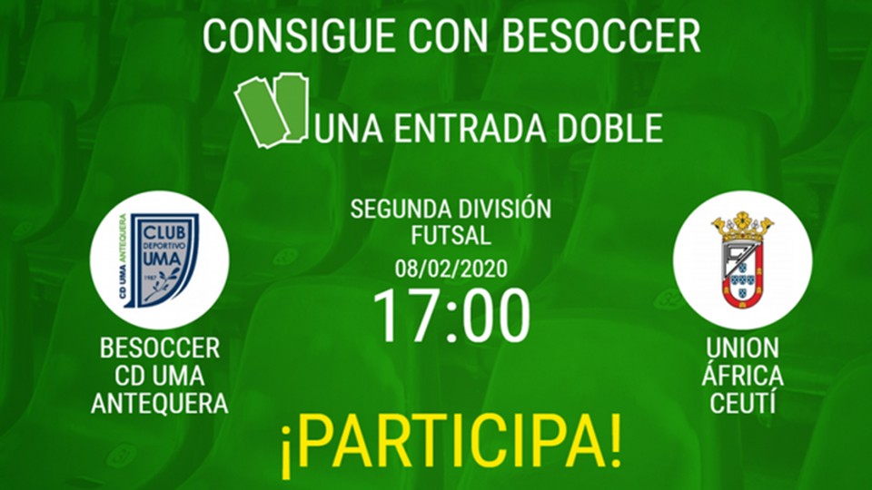 Gracias a BeSoccer podrás acceder al sorteo de una entrada doble para un encuentro del BeSoccer CD UMA Antequera. En este caso, para el BeSoccer CD UMA Antequera-Unión África Ceutí, que se disputará el próximo 8 de febrero de 2020, a partir de las 17:00 horas. ¡Entra en la 'app' de 'BeSoccer' y participa! ¿Qué cómo se hace?