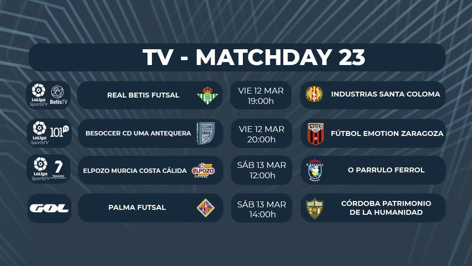 El menú televisivo del fin de semana lo abrirá el viernes a las 19:00 el duelo entre el Real Betis Futsal e Industrias Santa Coloma, que podrá seguirse en directo a través de LaLigaSportsTV y Betis TV. Los verdiblancos tratarán de sumar un triunfo que les permita seguir en puestos de Play Off, mientras que los colomenses buscarán sumar tres puntos que les ayuden a seguir alejándose de la parte baja de la tabla y poder mirar hacia arriba.