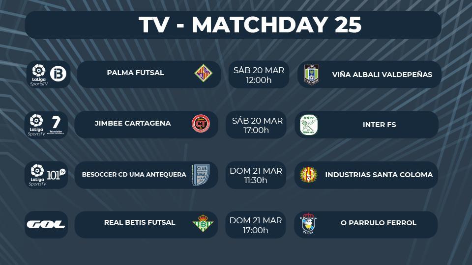 El menú televisivo lo inaugurará el duelo que medirá al Palma Futsal con el Viña Albali Valdepeñas este sábado a partir de las 12:00, en directo por LaLigaSportsTV e IB3. Los palmesanos afrontan el choque como una oportunidad de acercarse la lucha por el liderato y tendrán en frente a un Viña Albali Valdepeñas que quiere seguir asentado en los puestos de Play Off.