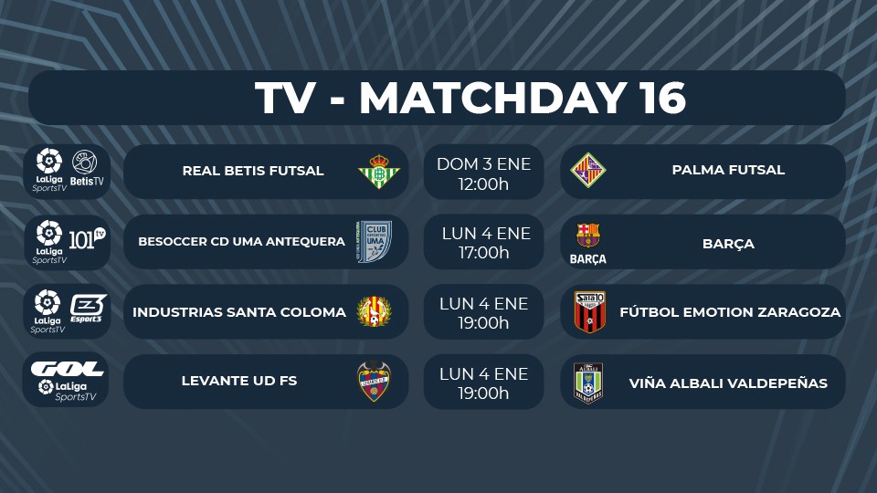 El menú televisivo de la Jornada 16 lo inaugurará este domingo un interesante duelo entre el Real Betis Futsal y el Palma Futsal, que se podrá seguir en directo a través de LaLigaSportsTV y Betis TV a partir de las 12:00. Los verdiblancos querrán sumar su segundo triunfo consecutivo para mantenerse en puestos de Copa de España, ante la visita del líder Palma Futsal, que tratará de conseguir los tres puntos para olvidar las últimas dos derrotas cosechadas.