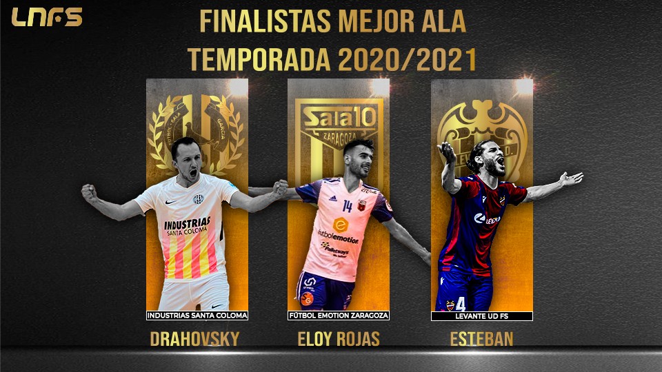 Una vez concluido el pasado jueves 15 de julio el plazo designado para la votación, los aficionados y medios de comunicación han establecido con sus votos que Drahovsky (Industrias Santa Coloma), Esteban (Levante UD FS) y Eloy Rojas (Fútbol Emotion Zaragoza) se encuentren en la terna de nominados para remplazar a Adri y Adolfo en la lista de el ‘Mejor Ala’ de la Liga Nacional de Fútbol Sala este curso liguero.