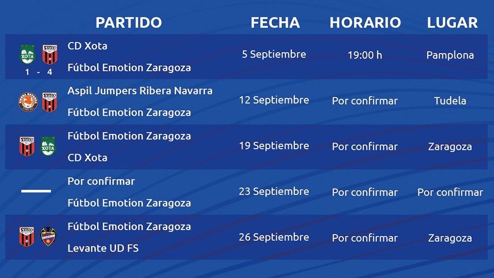 Tras la victoria en tierras navarras frente al CA Osasuna Magna por 1-4, el próximo sábado, 12 de septiembre, el equipo que dirige David Marín se desplazará hasta Tudela para medirse al Aspil Jumpers Ribera Navarra. Una semana más tarde, el 19 de septiembre, el conjunto maño se volverá a enfrentar al CA Osasuna Magna, esta vez, en Zaragoza. Y terminará la pretemporada con una intensa semana en la que se disputarán dos partidos: el primero, el día 23 de septiembre, con rival y lugar por confirmar; y el segundo, el día 26 de septiembre, contra el Levante UD FS en Zaragoza.