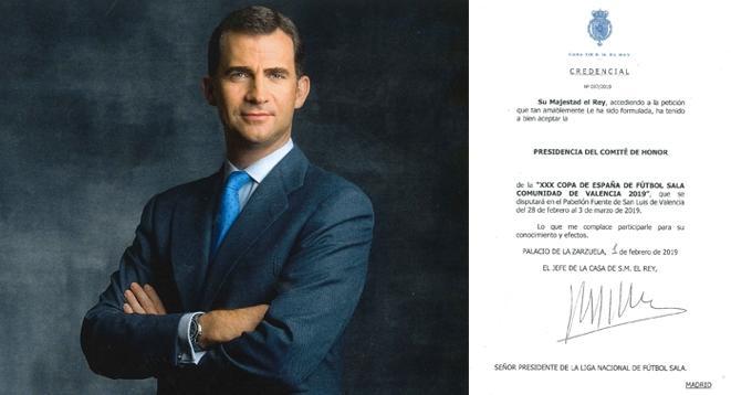 El Rey don Felipe ha aceptado la Presidencia del Comité de Honor de la Copa de España 'Valencia 2019', que se celebrará en la capital del Turia desde el próximo 28 de febrero hasta el 3 de marzo del año 2019. Así se le ha comunicado a la Liga Nacional de Fútbol Sala, mediante una carta dirigida al presidente de la LNFS, Javier Lozano, firmada por el Jefe del Gabinete de Planificación y Coordinación de la Casa Real, Emilio Tomé de la Vega, y que adjunta la credencial que da fe de este gesto.