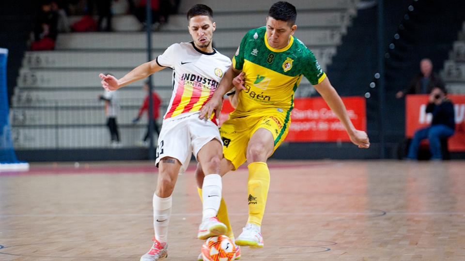 A medida que pasaba el tiempo, los amarillos se mostraron más activos ofensivamente, sobre todo gracias a la aportación de Mati Rosa. Pero Industrias Santa Coloma no se quedaba atrás, tratando de hacer el primer tanto del partido con algún acercamiento a la meta jienense. Después apareció Borja Puerta en el minuto 13, realizando una buena doble intervención que evitó que los visitantes se adelantaran en el marcador. El partido se convirtió en un encuentro de ida y vuelta, sucediéndose las ocasiones en ambas porterías, pero sin acierto por parte de los dos conjuntos. Hasta que en el minuto 15 Povill adelantó a los de Xavi Closas desde el segundo palo, tras una asistencia de Khalid que no logró despejar Renato. Pocos minutos más tarde Nil Closas estuvo cerca de ampliar la ventaja local, pero su disparo lo desvió Espindola con una buena intervención. El duelo se marchó al descanso con la ventaja por la mínima favorable a Industrias Santa Coloma, gracias a la diana firmada por Povill en el minuto 15.