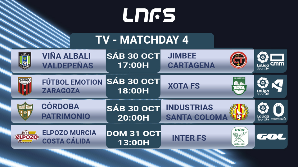 El sábado, Viña Albali Valdepeñas y Jimbee Cartagena abrirán el menú televisivo del fin de semana con un atractivo duelo que se podrá ver en directo por LaLigaSportsTV y CMM TV desde las 17:00. Una hora más tarde, el Fútbol Emotion Zaragoza recibe al Xota FS, en directo por LaLigaSportsTV, en un choque en el que los de David Marín buscarán sumar su primera victoria de la temporada.