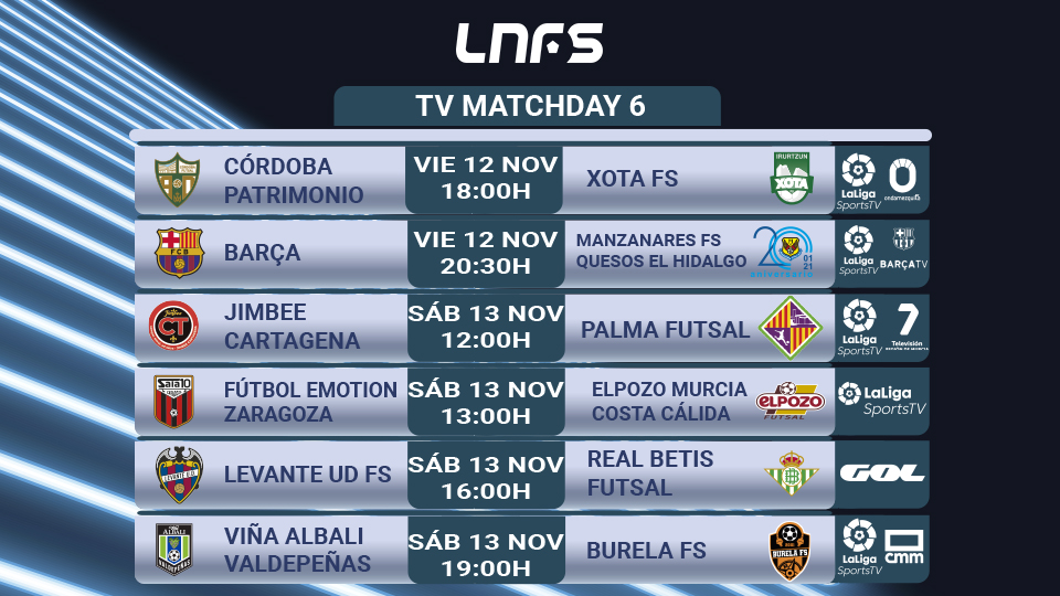 El menú televisivo del fin de semana lo abrirán Córdoba Patrimonio y Xota FS este viernes a partir de las 18:00, en directo por LaLigaSportsTV y Ondamezquita, en un duelo entre dos equipos situados en la zona noble de la tabla. A las 20:30 llegará el turno del choque entre Barça y Manzanares FS Quesos El Hidalgo (LaLigaSportsTV y Barça TV) en el que los azulgranas buscarán mantener su liderato ante un conjunto manzanareño que tratará de dar la sorpresa para sumar su primer triunfo de la temporada.