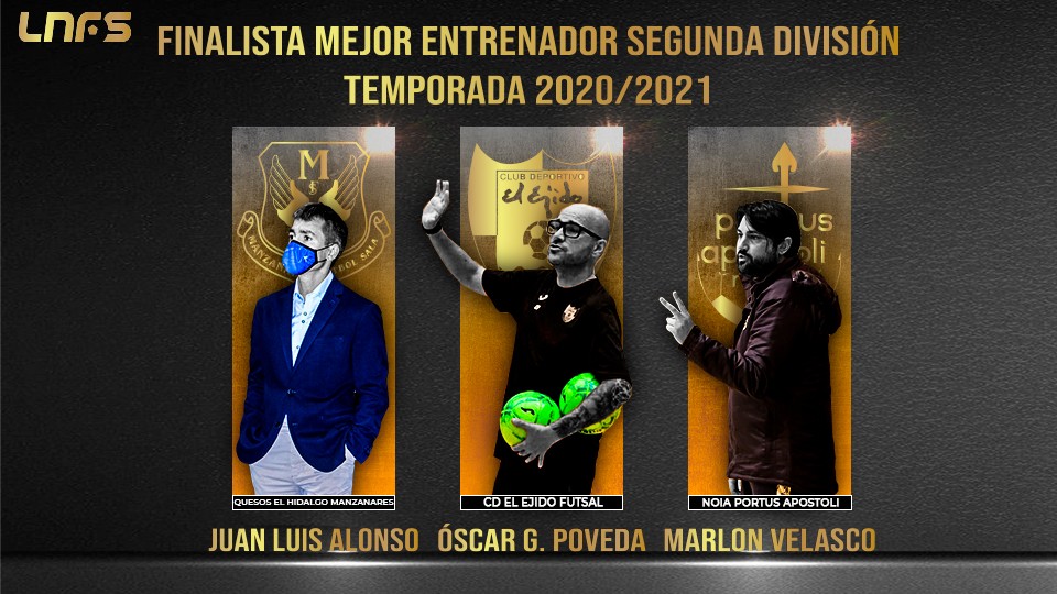 Una vez concluido el pasado jueves 15 de julio el plazo designado para realizar votación, los aficionados al Fútbol Sala y los medios de comunicación ya tienen a sus preferidos para ser el ‘Mejor Entrenador de Segunda División’ en la 2020/21: Juan Luis Alonso ‘Juanlu’ (Manzanares FS Quesos El Hidalgo), Marlon Velasco (Noia Portus Apostoli), Óscar García Poveda (CD El Ejido Futsal).