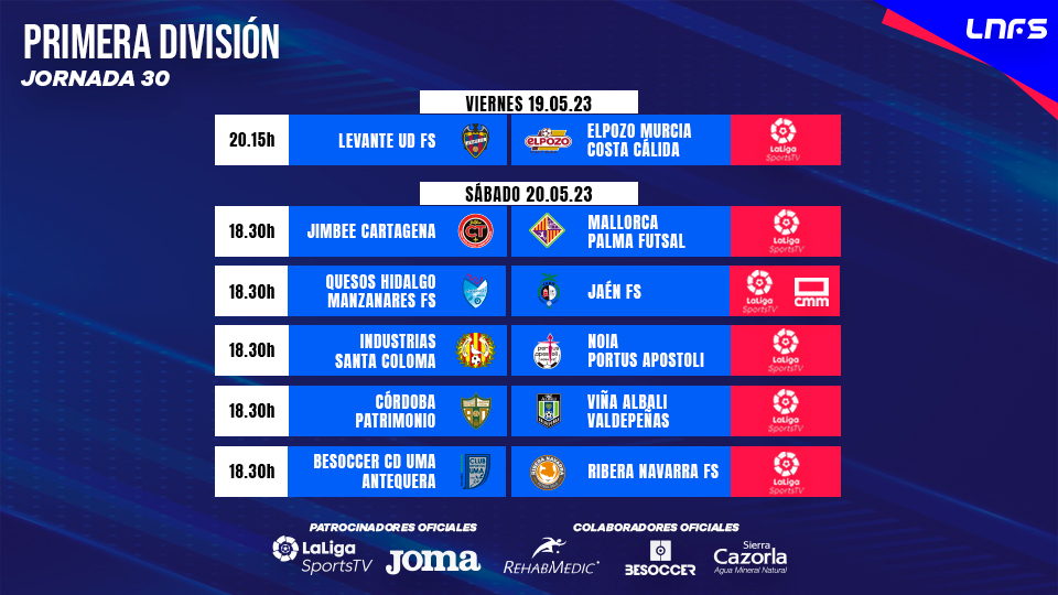 • LEVANTE UD FS – ELPOZO MURCIA COSTA CÁLIDA, viernes 19/05/2023 a las 20:15 horas en LaLigaSportsTV