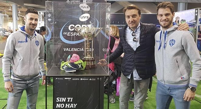 Los capitanes del equipo del Levante UD FS, Javi Sena y Márquez, y el portero de ElPozo Murcia FS, Fede, estuvieron en la inauguración de ExpoJove Valencia promocionando la Copa de España que se disputará en la ciudad del próximo 28 de febrero al 3 de marzo. En la mañana de hoy, el trofeo por el que lucharán los ocho primeros clubes al termino de la primera vuelta de la Liga Regular -y que actualmente ostenta Jaén Paraíso Interior- fue uno de los grandes reclamos de los más pequeños en la matinal de Fútbol Sala en la feria de la capital valenciana.