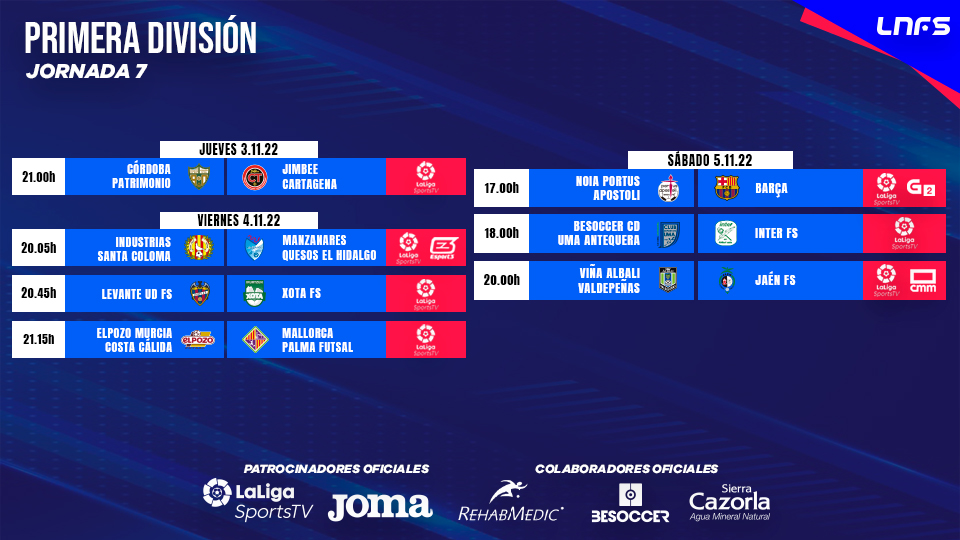 - JORNADA 7: ELPOZO MURCIA COSTA CÁLIDA – MALLORCA PALMA FUTSAL, viernes 04/11/2022 a las 21:15h en LaLigaSportsTV