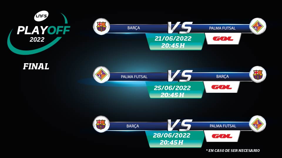 - TERCER PARTIDO (solo en caso de necesitar desempate): BARÇA – PALMA FUTSAL, martes 28/06/2022 a las 20:45 horas en GOL.