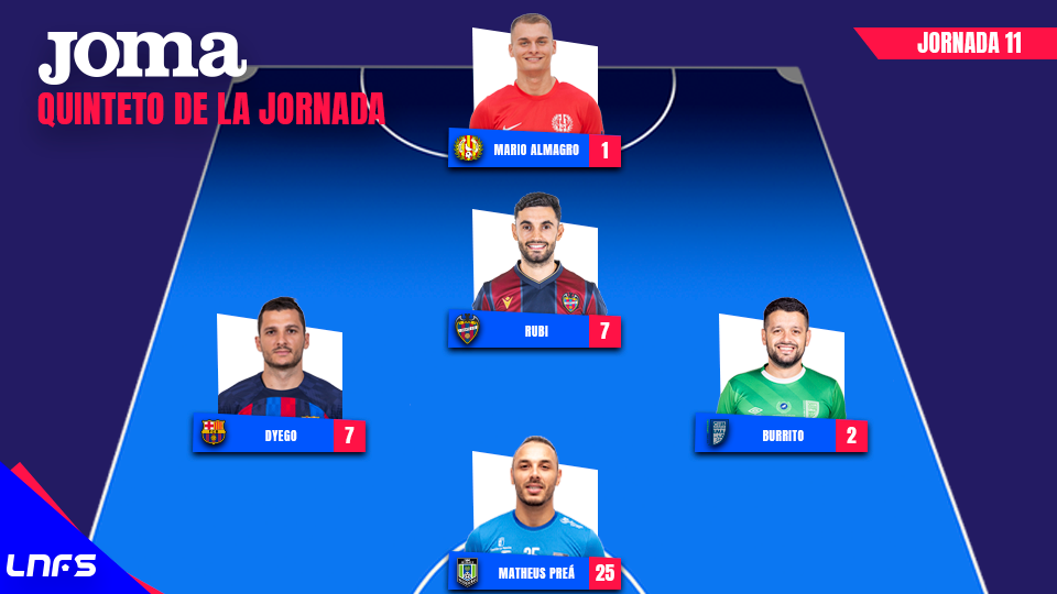 El público soberano eligió a Rubi Lemos como Jugador Estrella JOMA del partido destacado de este fin de semana, el que enfrentaba a BeSoccer CD UMA Antequera con Levante UD FS. El equipo granota no pudo llevarse el triunfo en un encuentro igualadísimo que se decantó por detalles en los minutos finales. Un poco antes, en el minuto 26 de juego, Rubi Lemos había anotado un auténtico golazo, enganchando una volea desde fuera del área que bota antes de entrar pegada al poste. De hecho, está entre los mejores goles de esta Jornada 11. La belleza de ese tanto, unida a la experiencia que demuestra cada semana jugador de Santiago de Compostela al servicio de Levante UD FS, le permiten entrar en el Quinteto Ideal