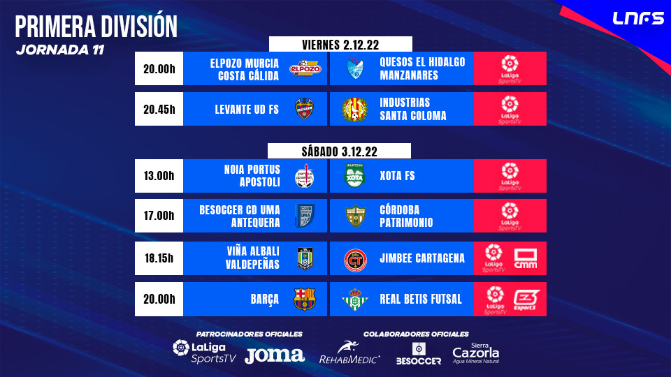 El Jimbee Cartagena visitará a Viña Albali Valdepeñas a las 18:15 en un choque en el que los azulones quieren dar continuidad al triunfo conseguido la pasada jornada, ante un conjunto cartagenero que suma cinco victorias consecutivas y quiere el liderato. Barça y Real Betis Futsal cerrarán la Jornada 11 a las 20:00 en el Palau Blaugrana, donde los culés tratarán de sumar tres puntos que les asienten en lo más alto de la tabla frente a una escuadra verdiblanca que quiere mantener intactas sus opciones de jugar la Copa.