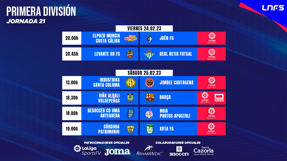 - LEVANTE UD FS – REAL BETIS FUTSAL, viernes 24/02/2023 a las 20:45 horas en LaLigaSportsTV | ¡En directo AQUÍ!