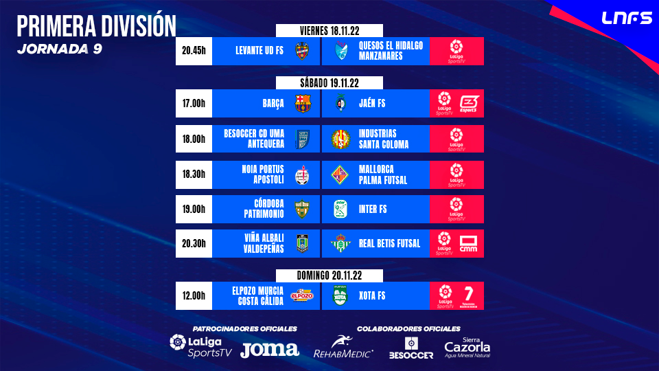 Levante UD FS y Quesos El Hidalgo Manzanares inaugurarán el viernes la Jornada 10 de Primera División con un choque que dará comienzo a las 20:45. Los granotas buscarán cerrar su dinámica de dos derrotas consecutivas, ante un conjunto que no quiere descolgarse de la zona de acceso a la Copa de España. Ya el sábado, Barça y Jaén se verán las caras a las 17:00 en un duelo en el que el líder tratará de seguir asentado en la parte más alta ante un conjunto jienense en racha.