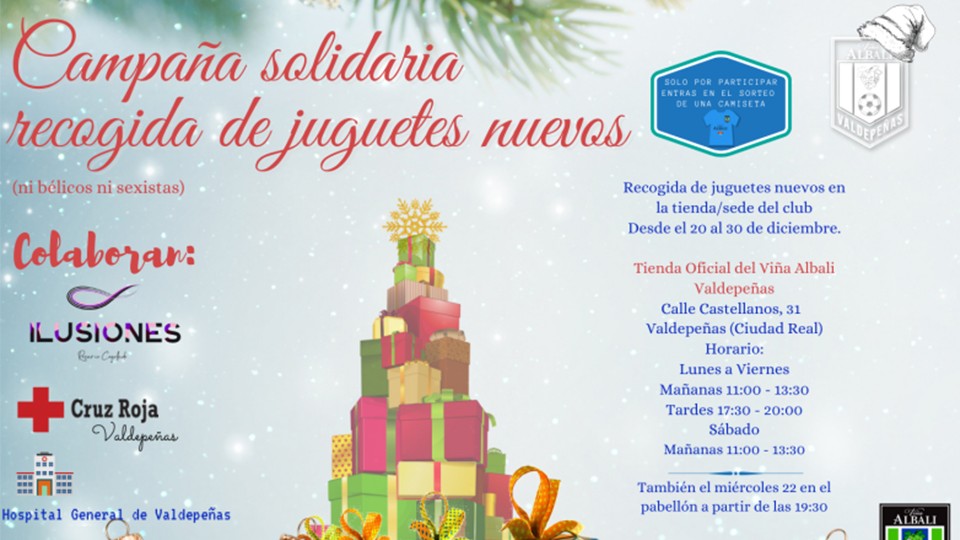 La entrega de estos juguetes se puede hacer en la tienda oficial del club Viña Albali Valdepeñas desde el día 21 de diciembre hasta el día 30 de diciembre en horario de 11:00 a 13:00 y de 17:30 a 20:00, así como en un stand que se colocará en el pabellón durante el partido contra Jaen FS.