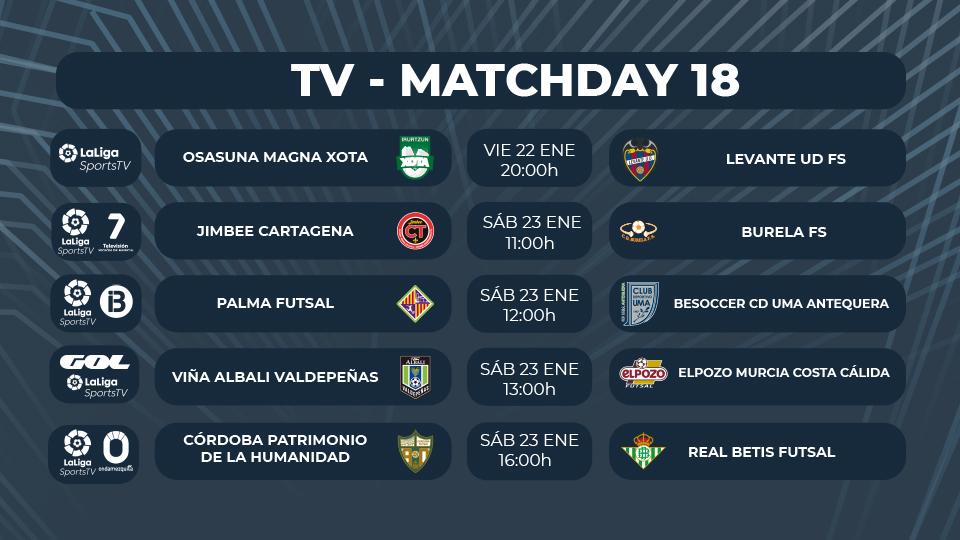 Ya el sábado, y desde primera hora, los aficionados podrán disfrutar de la emoción del 40x20 a través de la pequeña pantalla. Veinte días después de su último partido, Jimbee Cartagena recibe a Burela FS (11:00 horas | LaLigaSportsTV y La7) con el objetivo de refrendar su candidatura al liderato. En Son Moix, Palma Futsal recibe a BeSoccer CD UMA Antequera (12:00 horas | LaLigaSportsTV e IB3) en un partido con dos equipos al alza. Los baleares, que han recuperado el líderato, no quieren otro tropiezo como el de Antequera en Copa. Por su parte, los de Moli aspiran a derrotar de nuevo a Palma Futsal y conseguir esta vez tres puntos vitales en la lucha por la permanencia.