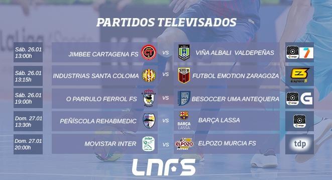 El primero de los encuentros del sábado podrá seguirse a través de LaLigaSportsTV y 7 TV, canal regional murciano. Jimbee Cartagena FS cayó derrotado la pasada jornada en su complicada visita a Anaitasuna, tras vencer los cinco anteriores encuentros.