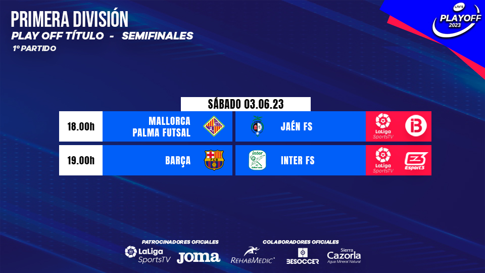 Sábado para disfrutar de la Liga Nacional de Fútbol Sala. Los dos partidos que inauguran las Semifinales se televisan por LaLigaSportsTV. Será el inicio del camino hacia la final: tanto el Barça como el Mallorca Palma Futsal intentarán hacer valer el factor pista y adelantarse en sus respectivas series contra Inter FS y Jaén FS, respectivamente.