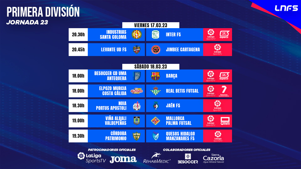 El sábado coinciden cinco partidos el sábado por la tarde, así que es momento de multipantalla para no perderse nada de la Jornada 23. A las seis de la tarde, en el Fernando Argüelles, BeSoccer CD UMA Antequera recibe al Barça, que viene de perder contra Noia Portus Apostoli. Al partido no le faltan alicientes: tras la recuperación de Ferrao, reaparecerá Dyego sábado. Los de Jesús Velasco necesitan acelerar en el sprint final por el liderato porque Mallorca Palma Futsal viene pisando fuerte. El partido se ve por LaLigaSportsTV y Esport3.