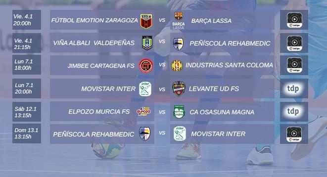 El mismo viernes, Viña Albali Valdepeñas – Peñíscola RehabMedic se verán las caras desde las 21:15 en un encuentro que será retransmitido a través de LaLigaSportsTV y CMM TV. Ya el lunes 7 enero a partir de las 18:00 las cámaras de LaLigaSportsTV y 7 TV serán testigos del Jimbee Cartagena FS – Industrias Santa Coloma. La jornada televisiva la cerrará el mismo lunes el partidazo entre Movistar Inter y Levante UD FS, que será retransmitido por Teledeporte desde las 20:00.