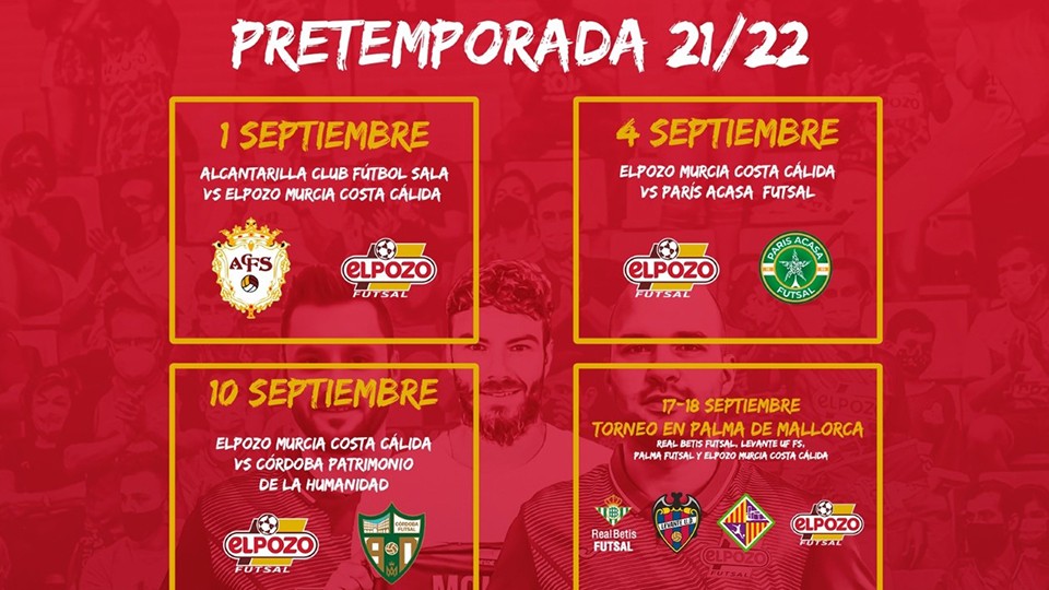 Hasta el miércoles por la mañana los jugadores se someterán a diferentes evaluaciones con los fisioterapeutas y el cuerpo médico para un inicio óptimo. Con el inicio liguero previsto para el 9 de octubre, ElPozo disputará en septiembre los encuentros amistosos de preparación de la competición. El día 1 se enfrentarán a Alcantarilla Club Fútbol Sala a domicilio. El sábado 4 recibirán a París ACASA Futsal y el 10 recibirán a Córdoba Patrimonio de la Humanidad. A la semana siguiente disputarán en Palma de Mallorca un torneo junto a Real Betis Futsal, Levante UDFS y Palma Futsal. Y el 25 de septiembre en tierras valencianas se enfrentarán a Levante UDFS.