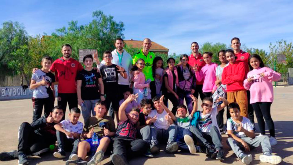 Tras la sesión matinal, los tres capitanes del equipo melonero: Raúl, Juanpi y Jesús, acompañados del segundo entrenador, Rafa Fernández, acudían al centro escolar Vicente Medina para disfrutar de una lúdica jornada.