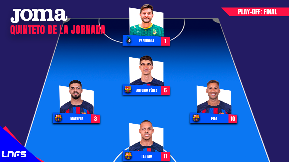 Con 23 años, Antonio Pérez se ha echado a todo un Barça a la espalda. Fundamental en defensa en todas y cada una de las eliminatorias. Ha ido ganando peso en el equipo a medida que avanzaba la temporada, y la cierra conquistando su primera Liga en su ciudad natal. Velasco le ha puesto de titular en dos de los tres partidos y ha podido parar el arsenal ofensivo de Jaén FS, sobre todo a Mati Rosa y Alan Brandi como pivotes.