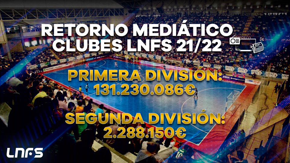 La LNFS mantiene en su estrategia de marketing y comunicación su apuesta por dar valor a los clubes y sus patrocinadores, potenciando la rentabilidad de su inversión gracias a la difusión que la Asociación realiza durante la temporada al dar cobertura diaria a la competición, que se ve reflejada en televisión, radio, prensa escrita y a través de las redes sociales. Con estos datos, la consultora Kantar Media ha remitido a la LNFS, y ésta a sus clubes, los informes auditados correspondientes a la temporada 2021/2022, en los que ha registrado un retorno mediático en televisión y prensa por un valor 131.230.086€ para Primera División y de 2.288.150€ para Segunda División.