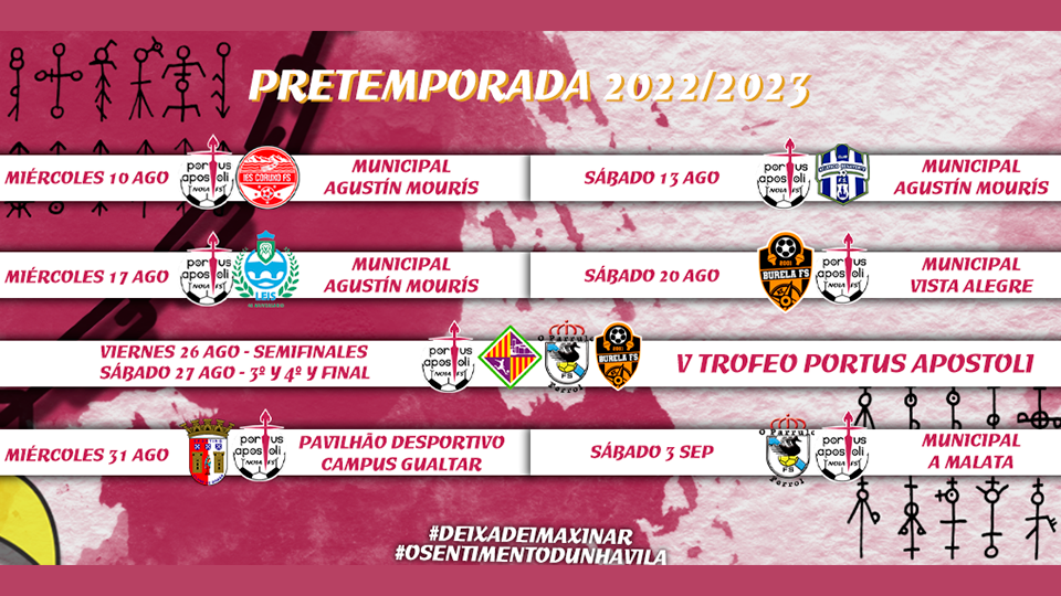 El primer viaje de pretemporada se producirá el sábado 20, cuando los noieses se enfrentarán al Burela, más de tres meses después del duelo de semifinales de Copa Galicia. Después, entre el 26 y el 27 de agosto, será el turno de la ya habitual cita estival de pretemporada, con la quinta edición de un Trofeo Portus Apostoli que año tras año sigue ganando prestigio, en esta ocasión con la presencia de Palma Futsal, O Parrulo Ferrol y Burela FS. El Agustín Mourís acogerá el que en esta ocasión será un torneo por eliminatorias, con las dos semifinales (que serán Noia Portus Apostoli - O Parrulo Ferrol y Palma Futsal - Burela FS) programadas para el primer día y el partido por el tercer y cuarto puesto y la final para el segundo.