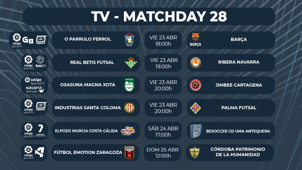El viernes comienza la Jornada 28 en la élite del Fútbol Sala nacional y lo hace con un duelo de urgencia para O Parrulo Ferrol, que recibe la visita del Barça (18:00 horas) y que podrá verse a través de LaLigaSports, TVG2 y Esports3. Una hora después, el balón echará a rodar en Amata en el duelo entre Real Betis Futsal y Ribera Navarra (LaLigaSportsTV y BetisTV). A partir de las 20:00 horas darán comienzos los duelos entre Osasuna Magna Xota y Jimbee Cartagena (LaLigaSportsTV y Navarra Televisión) y el Industrias Santa Coloma – Palma Futsal (LaLigaSportsTV y Esports3).