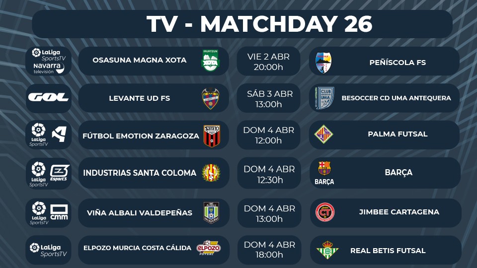 El menú televisivo lo abrirá este viernes el duelo entre Osasuna Magna Xota y Peñíscola FS a partir de las 20:00, en directo por LaLigaSportsTV y Navarra TV. A las 13:00 del sábado llegará el turno del partidazo de GOL entre el Levante UD FS y el BeSoccer CD UMA Antequera, en un choque que medirá al líder de la categoría contra una escuadra universitaria que pelea por salir de los puestos de descenso.