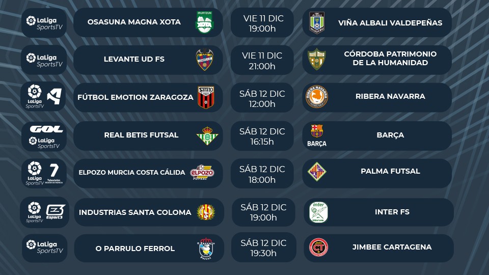 El menú televisivo del fin de semana lo abrirá el viernes a las 19:00 el duelo entre Osasuna Magna Xota y Viña Albali Valdepeñas, un auténtico partidazo que podrá seguirse a través de LaLigaSportsTV. A las 21:00 llegará el turno de la visita del Córdoba Patrimonio de la Humanidad a la cancha del Levante UD FS, también a través de LaLigaSportsTV.