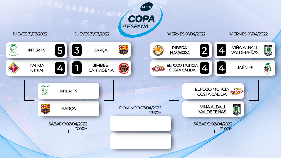 Barça e Inter FS reeditarán en las Semifinales de la Copa de España la Final de la pasada edición. La eliminatoria, después de que ambos conjuntos se hayan visto en apuros en Cuartos de Final, se prevé como el plato fuerte del sábado en Jaén (17:00 horas), puesto que se ven las caras los equipos que se han repartido 16 de los 32 títulos disputados en este campeonato. Uno de los históricos, sin embargo, deberá despedirse en esta ocasión antes de tiempo y dejar vía libre a su máximo rival en la carrera ante un nuevo aspirante.